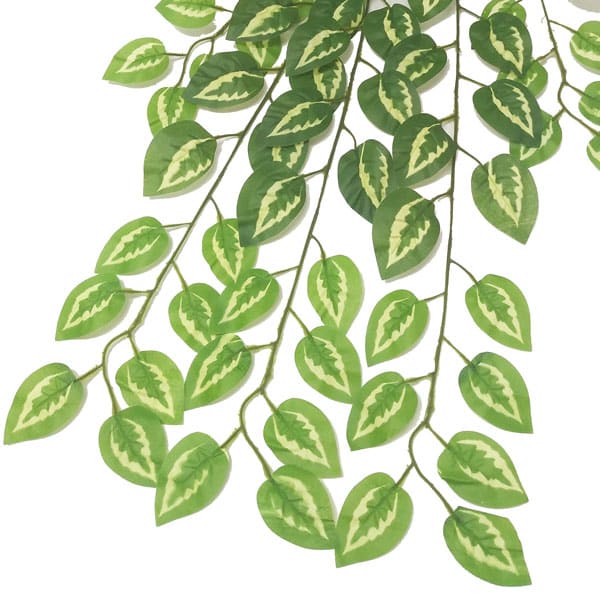Tinhorão Folhagem Pendente Artificial que tem uma coloração variegada, em branco e verdes, muito ornamental. Assim, essa planta artificial tem 107 folhas e 11 hastes de medidas variadas. Por fim, muito usava em vasos suspensos e decoração de Jardim Vertical.